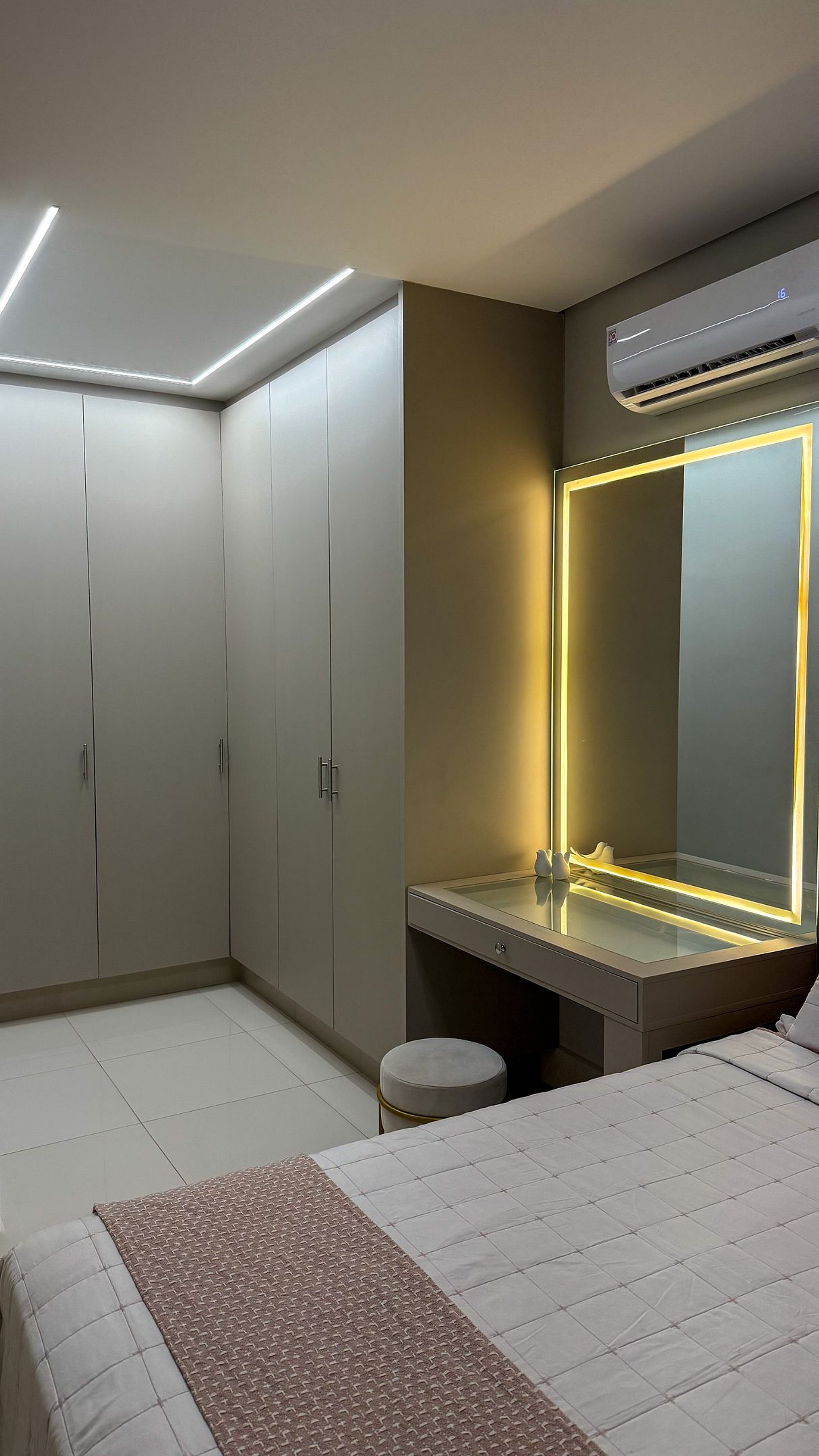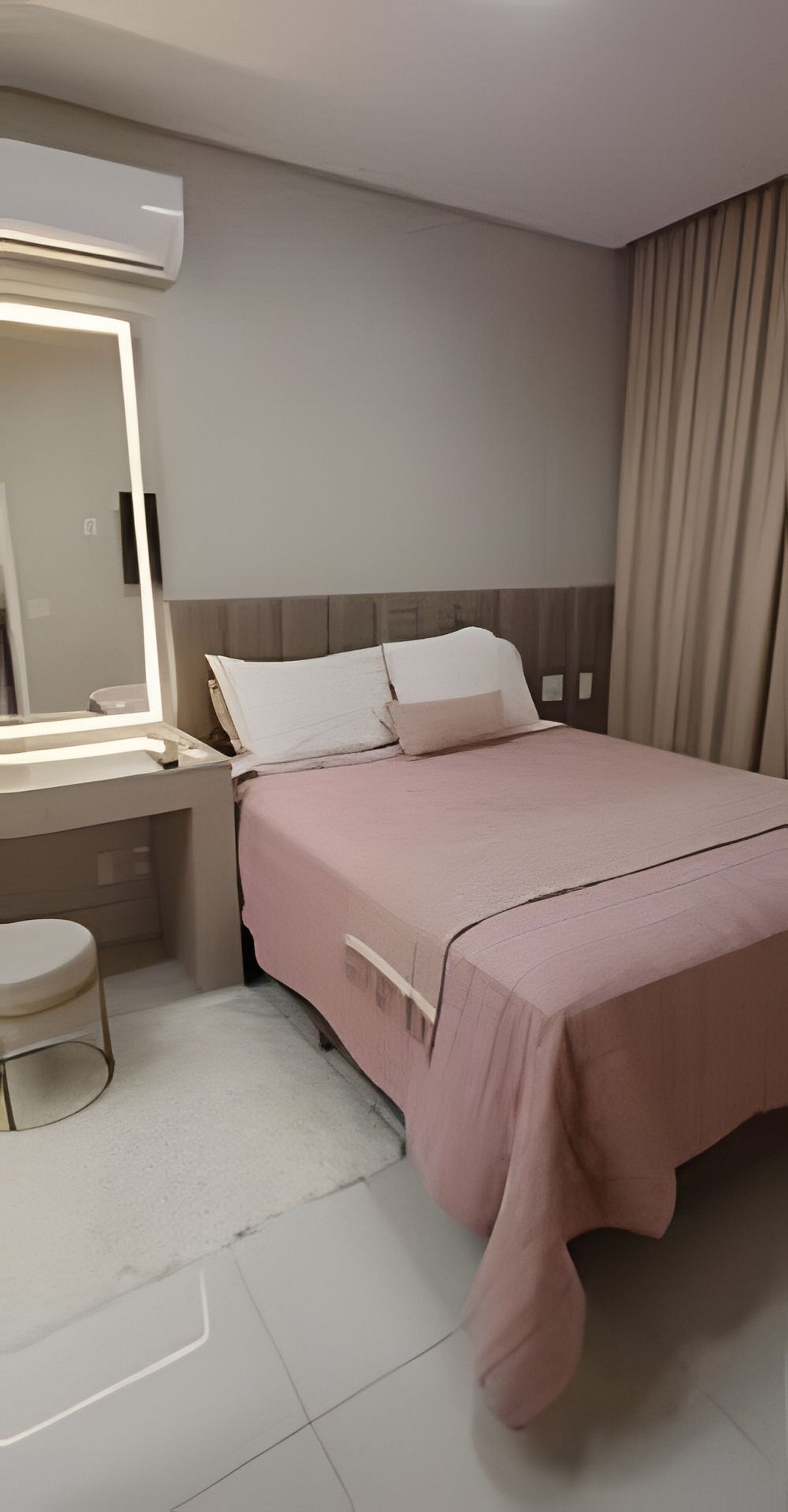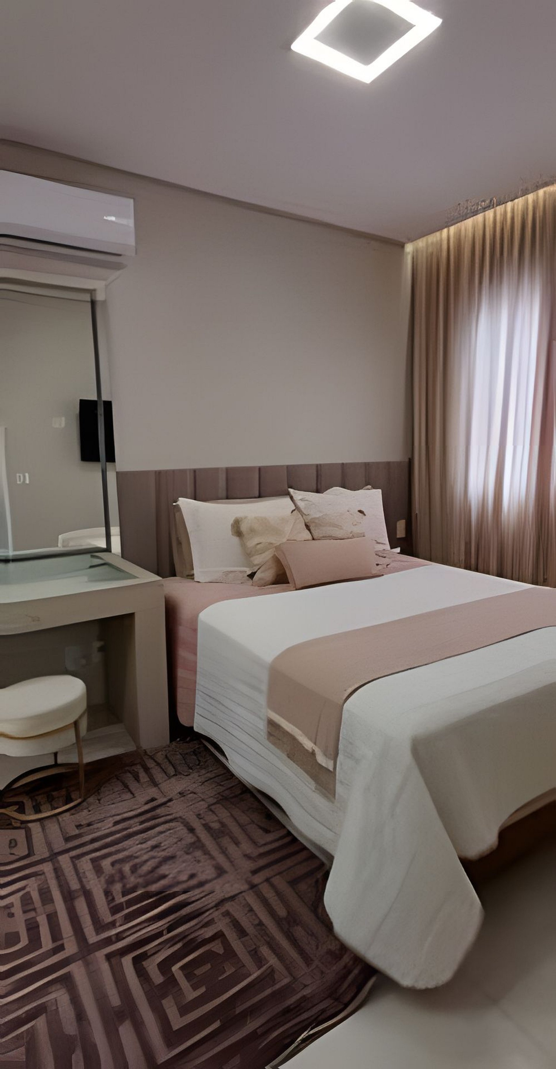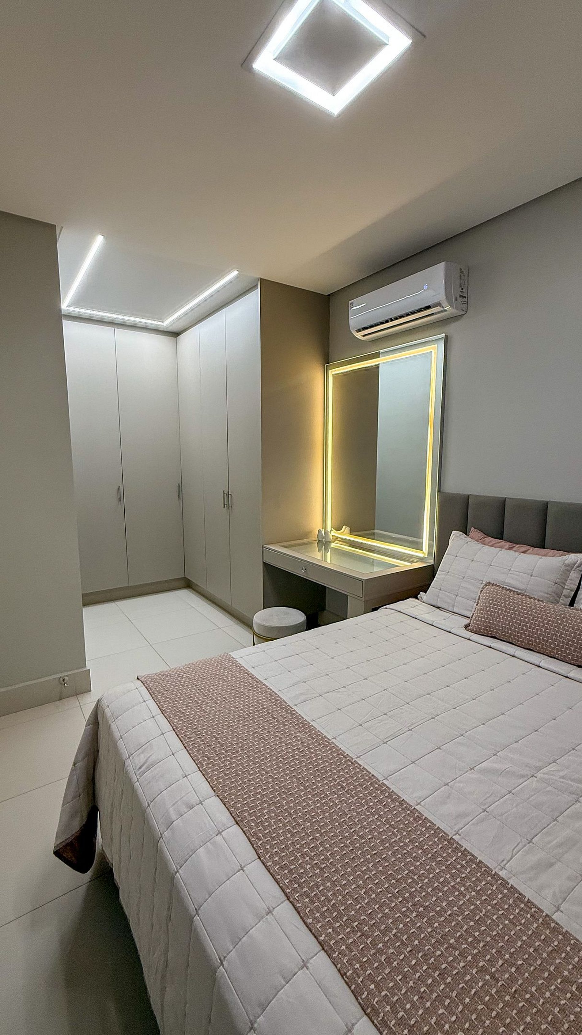 Quarto 1: cama queen, ar-condicionado e espaço para maquiagem.