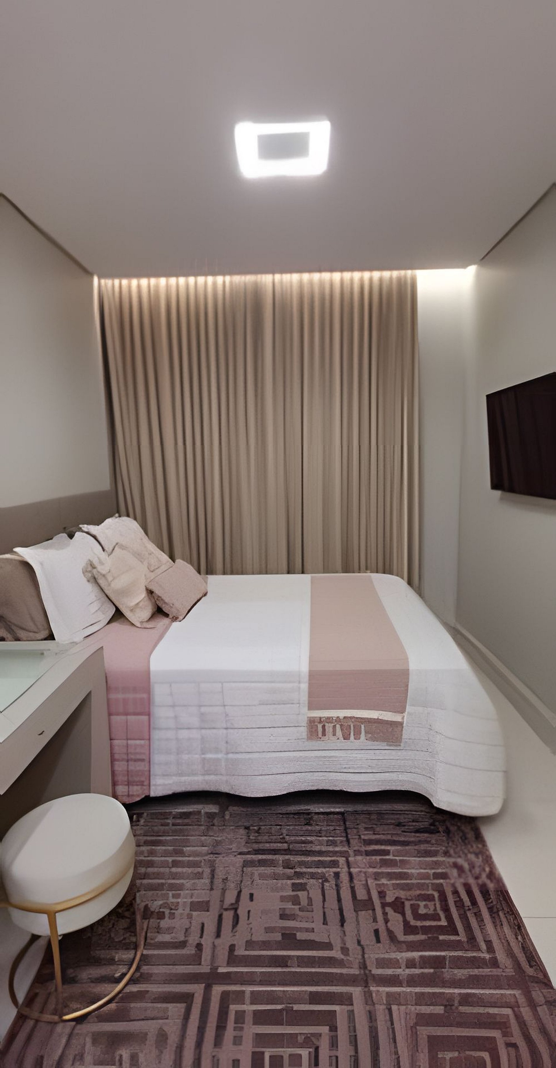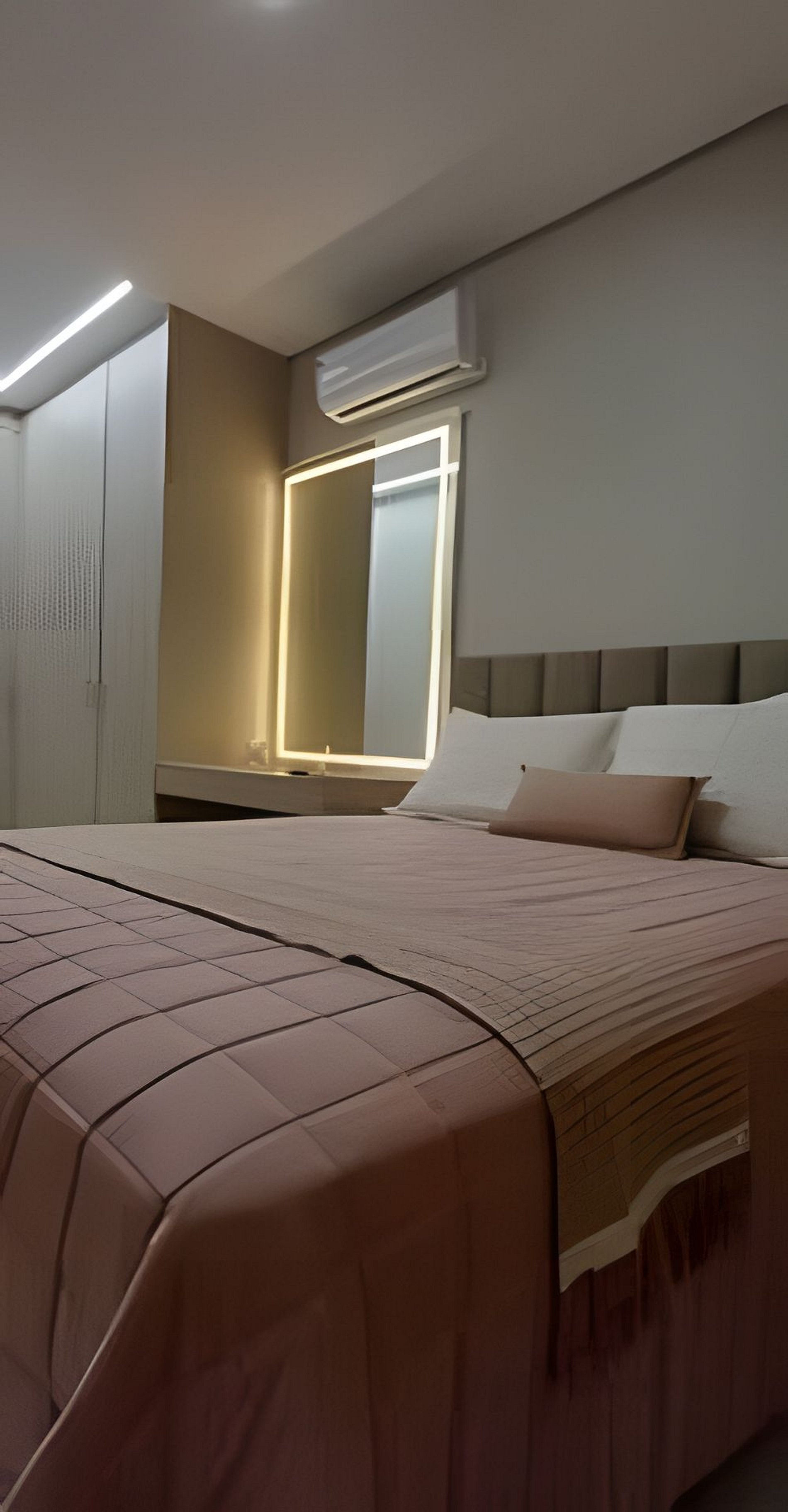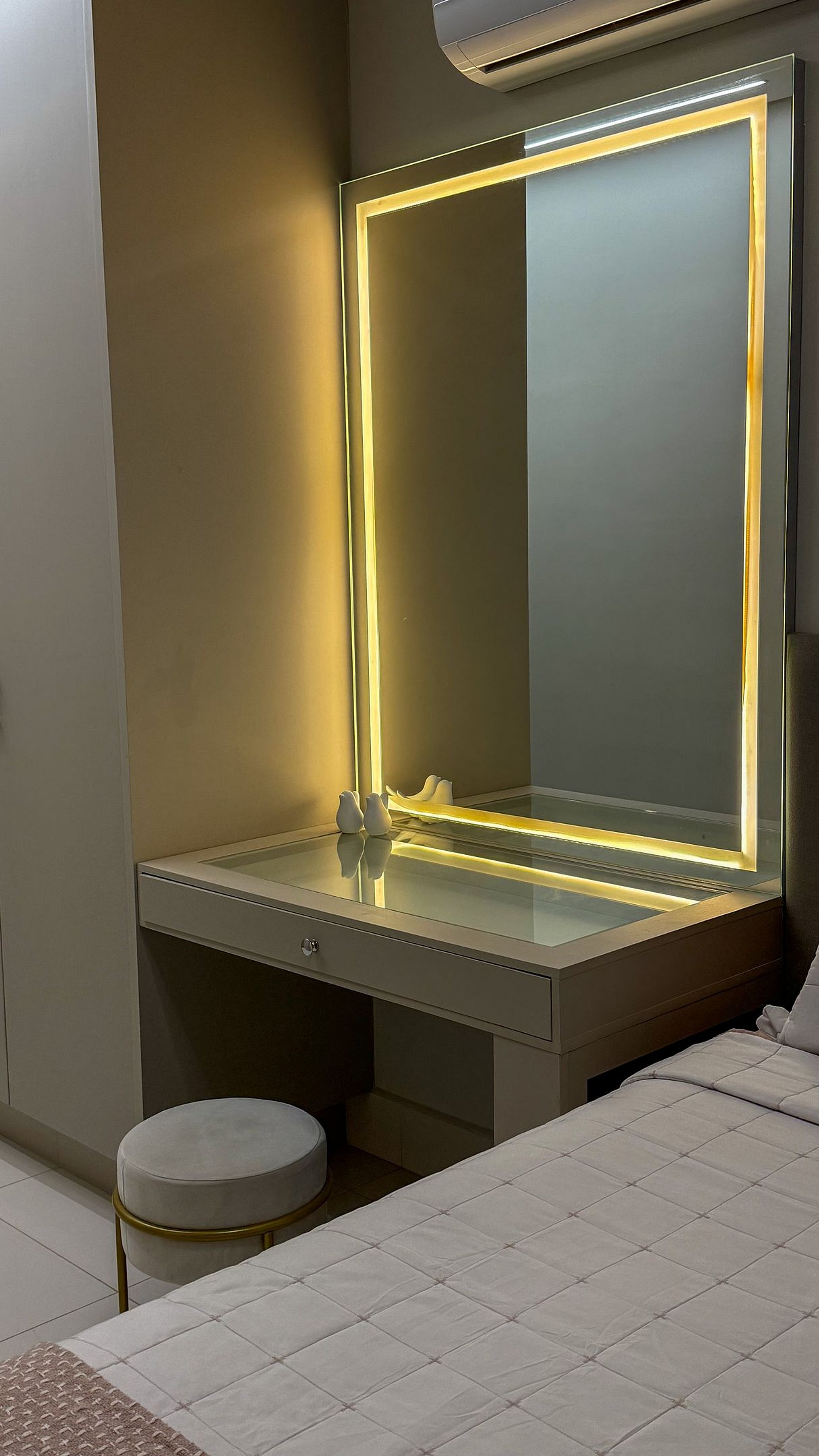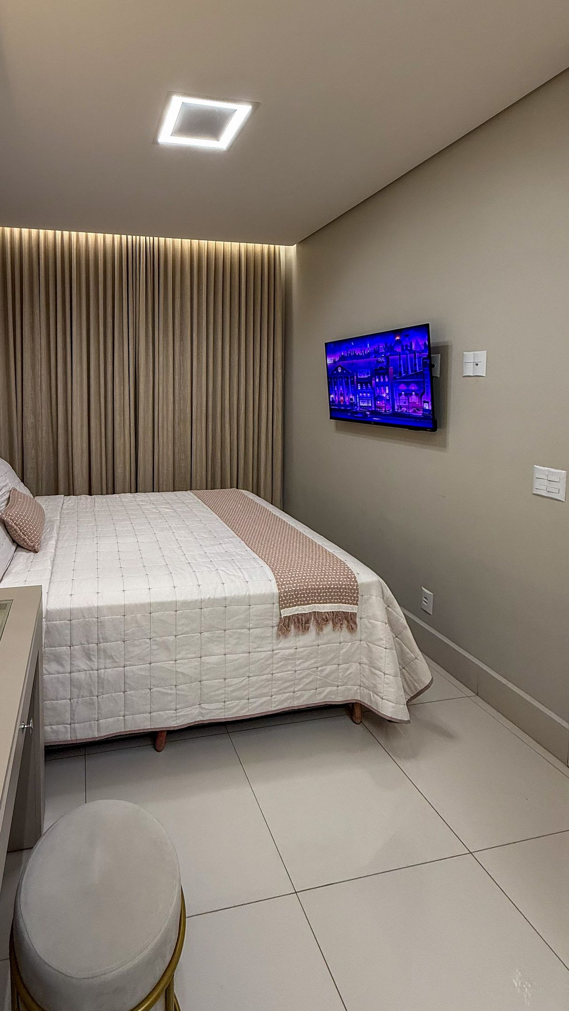 Quarto 1: cama queen, ar-condicionado e espaço para maquiagem.