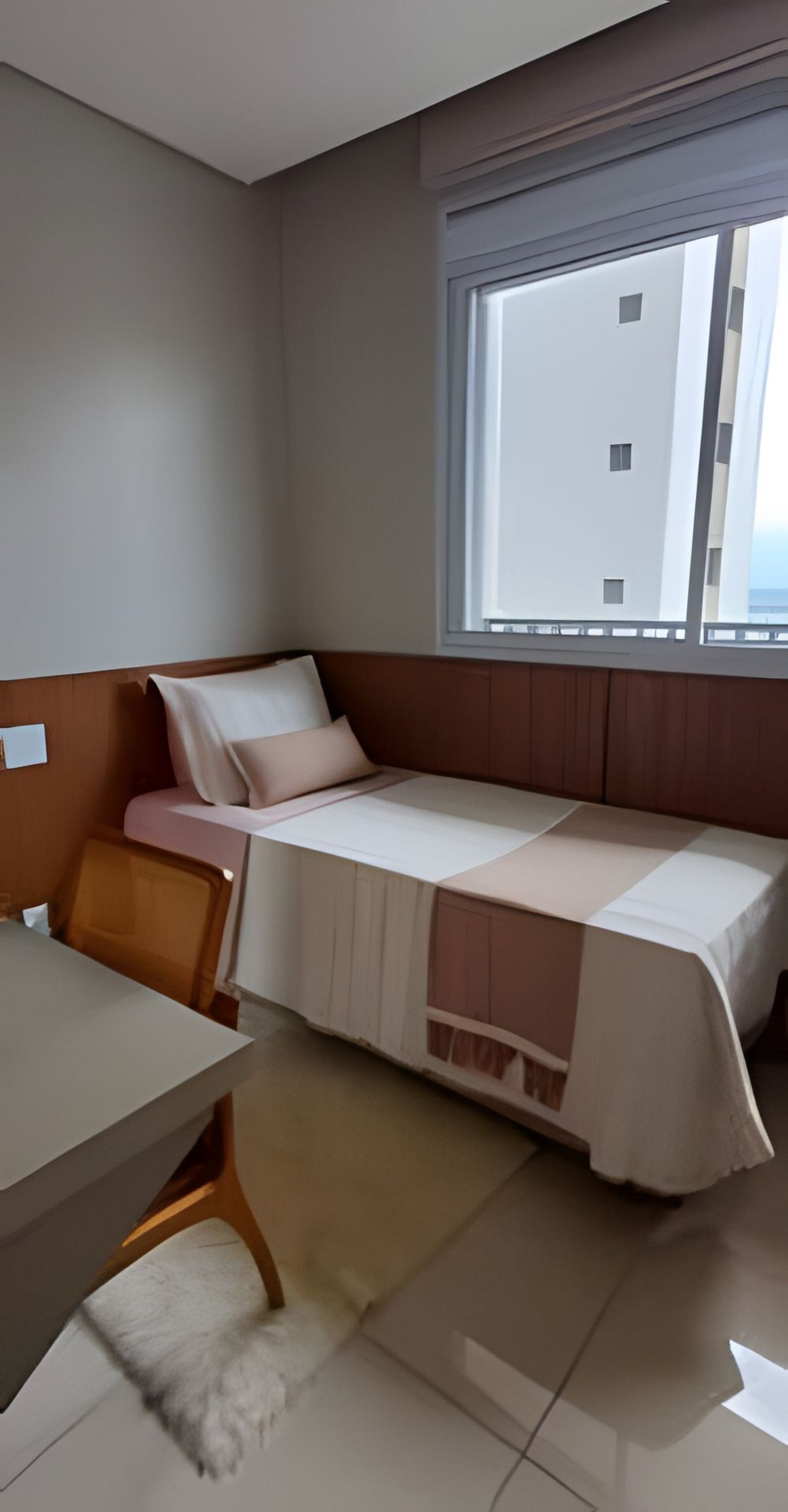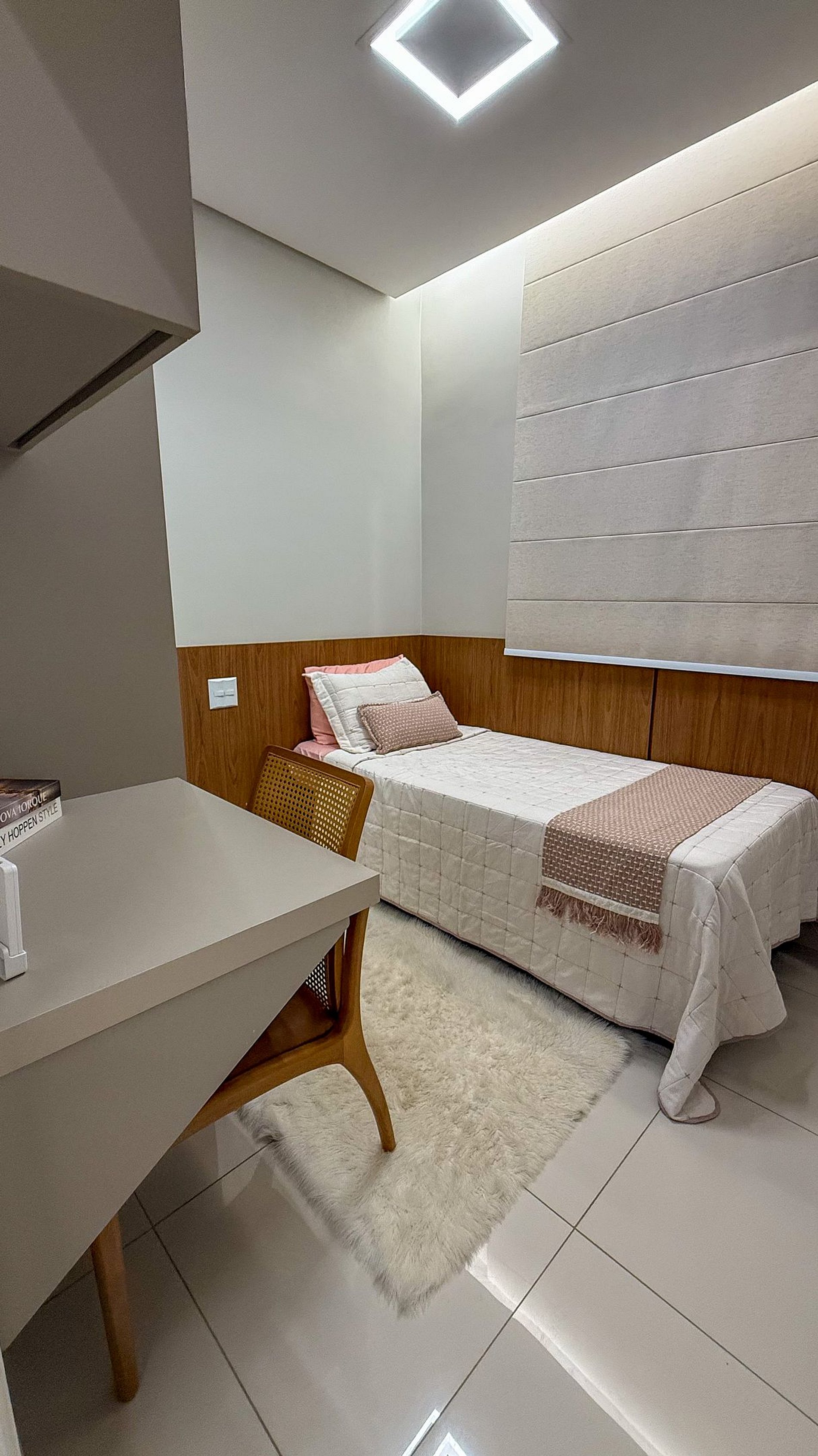 Quarto 2: bi-cama, guarda-roupa, ar-condicionado e estação de trabalho.