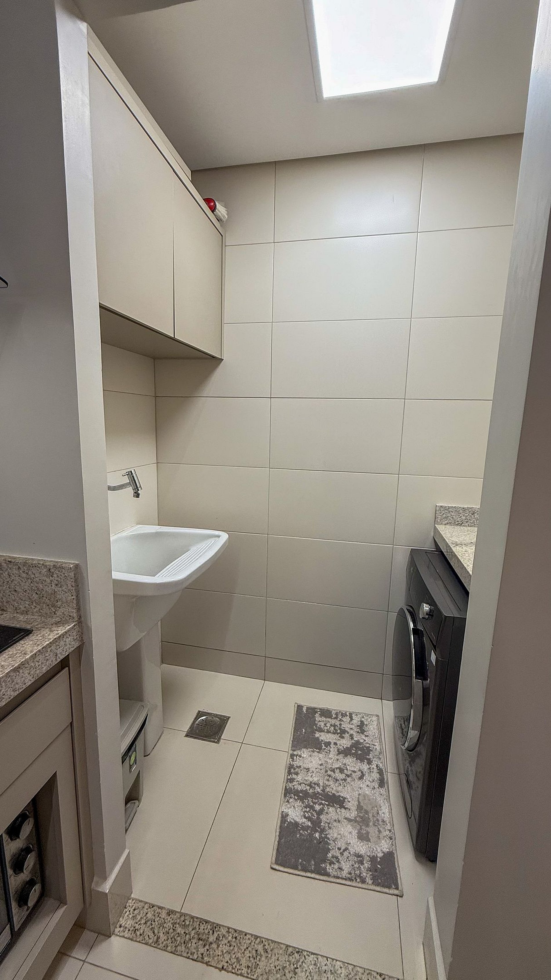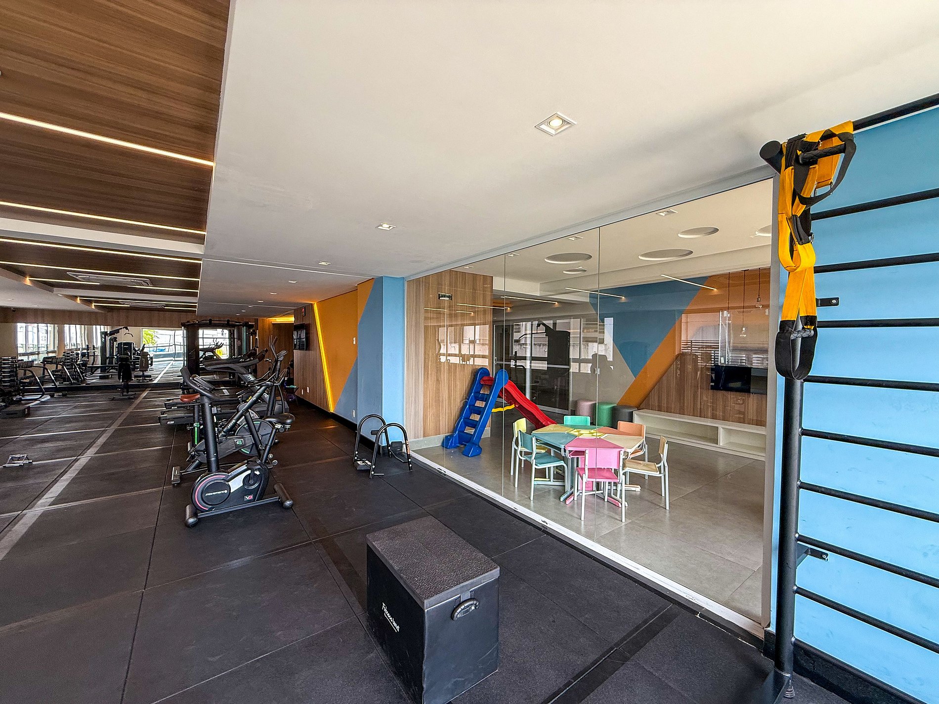 Sala com cozinha integrada, equipada, climatizada e com lavanderia.